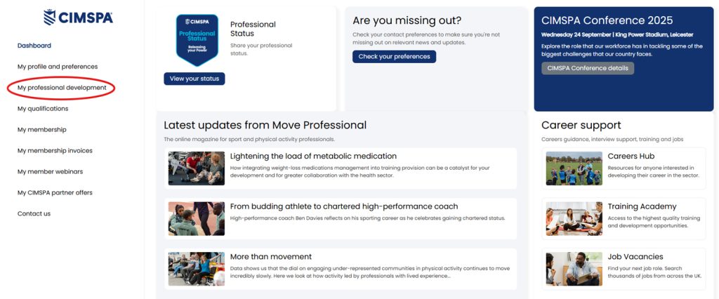 1 – Log in to your CIMSPA Dashboard and click ‘My professional development’