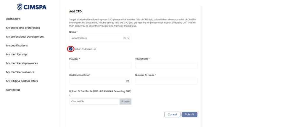 Title Of CPD – for endorsed CPD simply search our database of endorsed courses and select the course you are looking for. For non-endorsed CPD tick the ‘Not on Endorsed List’ and you will see additional fields that allow you to enter the title of the course and the provider.